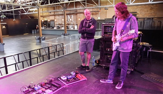 Spend an hour with the funk-punk rockers as they go over all the PRS and Gibson 6-strings, Warwick bass gear, and piles of pedals that stir up their tone.